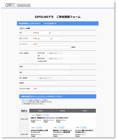 参加者予定者のプロフィール入力はもちろん参加予定講演の事前登録や、事前アンケートの回答入力が可能なフォームが構築可能。