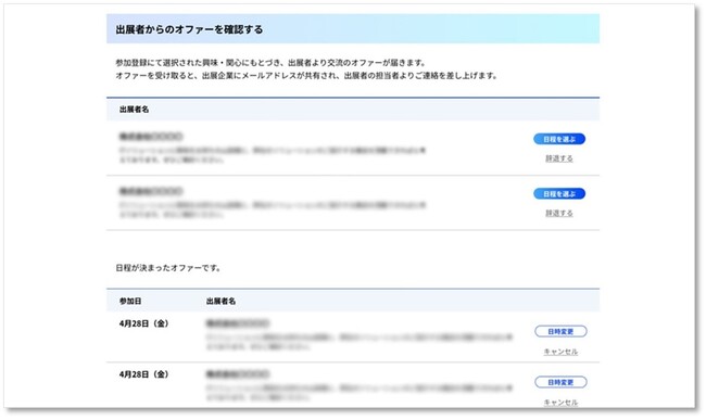 参加者と参加者のマッチング出展社から参加者に向けたオファーなど、イベント期間での効率的で生産性の高い出会いを創出するためのマッチング機能を実装することが可能。