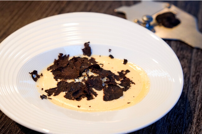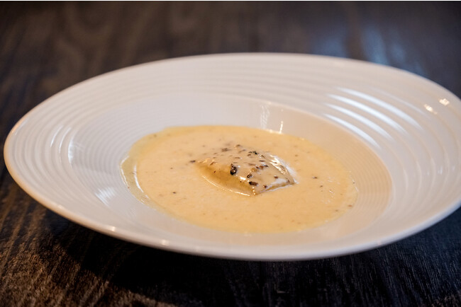 一般的なじゃがいもよりも、甘みが強く風味がよいのが特徴の北海道産自然栽培”さやあかね”を、丁寧にバターローストし、黒トリュフの香りをたっぷりと閉じ込め濃度を持たせた特製トリュフクリームスープと合わせました。トリュフの香りを存分に楽しめる自慢の一品です。トリュフ専門店ならではのリッチな味わいをお楽しみください。