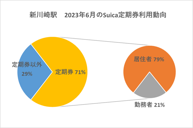 Suicaデータや駅カルテ※を分析すると、改札のSuica利用割合は85%~90%と高く、「通勤定期券を保有しているお客さま」は71%、そのうち新川崎駅付近の居住者の割合は79%となっております。また、29%の「定期券以外または定期券区間外でのSuicaを利用されるお客さま」のうち、1か月の間で同駅を再度利用される方の割合は、JR東日本エリアの中で上位に入り、お客さまがSuicaを習慣的に利用されていることがわかりました。
