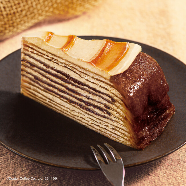 ショコラクレープ生地に、パリパリ食感のチョコと、やさしい甘みとほろ苦さをほのかに感じるキャラメル風味のホイップクリームをサンドした、季節限定のミルクレープです。