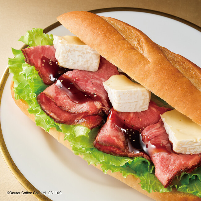 「贅沢ミラノサンド 直火焼きローストビーフ ~赤ワインバルサミコ酢ソース~」に、カマンベールチーズを合わせました。肉質のやわらかな肩ロースを使用したローストビーフと、チーズのまろやかな味わいをお楽しみいただけます。