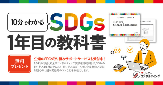 月額3万円からはじめられる「SDGsコンサルティング」、ISO/Pマークの取得・運用支援サービス「認証パートナー」を提供する株式会社スリーエーコンサルティング(本社:大阪府大阪市、代表取締役社長:竹嶋 寛人)は、新資料『10分でわかる SDGs1年目の教科書』をサイトで公開、無料プレゼントを開始しました。「SDGsに取り組みたいけど、何から始めたらいいのかわからない、そもそも基本的な知識がない・・・」とお悩みの方へ、8,000件を超える企業コンサルティング実績を誇る弊社が、SDGsの取り組み1年目にやること、取り組みのゴール例、企業登録/認証制度や取り組み開始時のコツなどを『SDGs1年目の教科書』としてまとめました。本資料を通じて、企業のSDGs取り組みへの第一歩を後押しします。