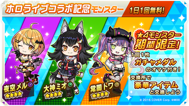 ホロライブ所属の「夜空メル」「大神ミオ」「常闇トワ」が期間限定ガチャに登場します。