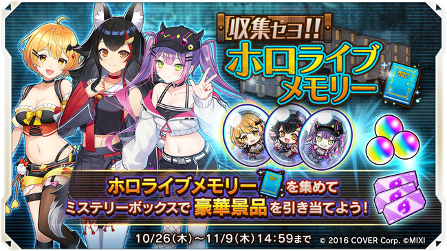 10月26日(木)メンテナンス後~ 11月9日(木)14:59までコラボ限定収集イベント【収集セヨ!!ホロライブメモリー】を開催します。専用の収集アイテム「ホロライブメモリー」をゲーム内で集めてミッションをクリアすると、ホロライブコラボモンスターガチャチケットやコラボ限定称号などが手に入ります。