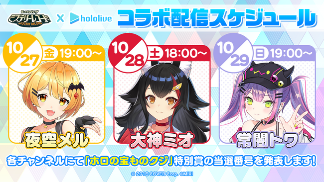 「夜空メル」「大神ミオ」「常闇トワ」の3名が10月27日(金)から10月29日(日)に、それぞれ「ミリコド」をプレイする生配信を実施します。また、各配信にて現在開催中の「ホロの宝ものクジ キャンペーン」の一部賞品の当選者発表を行います。