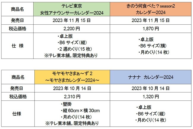 2024年版カレンダーは全4種類、「テレ東本舗。」で販売・予約受付中!