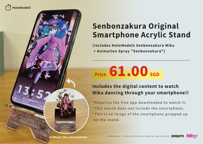 本イベントでは、Gugenkaが提供するMRサービス「HoloModels」のMR版を使用することで、リアルとバーチャルが融合した空間で初音ミクが楽曲「千本桜」にあわせて舞う姿を無料で鑑賞いただけます。また、HoloModelsと連動したアクリルスマホスタンドを会場で先行販売いたします。