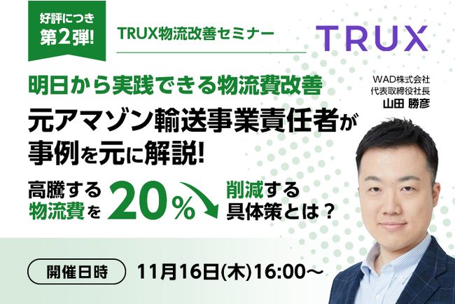- 【メーカー 物流・SCM部門向け】TRUX物流コスト削減オンラインセミナー 第3弾!11/07 15:30