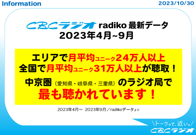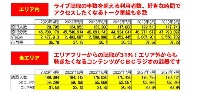 CBCラジオは、2023年度上半期(同年4月から9月の6ヶ月間)で、愛知・岐阜・三重の中部3県全10局において、ライブ(リアルタイム聴取)/タイムフリー(放送後1週間以内のアーカイブ聴取)/トータルの聴取者数・聴取者占有率・STREAM(再生数)においてエリア1位を獲得しました。