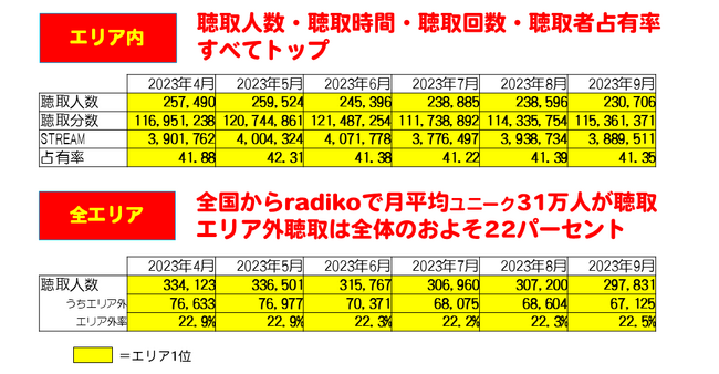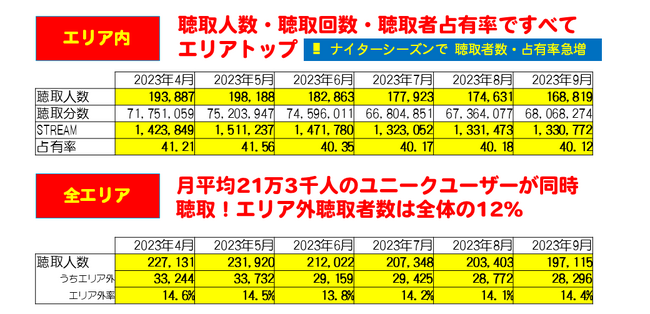 調査対象期間はプロ野球のシーズンでもあり、エリア内での聴取人数はシーズンオフ(2022年10月~2023年3月)に比べて、月平均3万人増となっています。