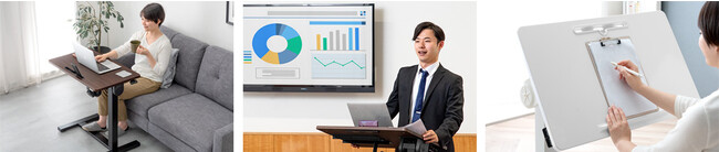 PCを使用してリモートワークや会議をする場合にも天板を低くすることで通常の作業用デスクとして使用することが可能です。また、天板の高さを上げることでスタンディングデスクや講演台などオフィスシーンにも便利です。