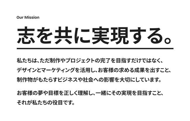 私たちは事業成長を支援するデザインとマーケティングの会社です。「志を共に実現する」というミッションを掲げ、ただ制作やプロジェクトの完了を目指すだけではなく、お客様の求める成果を出すこと、制作物がもたらすビジネスや社会への影響を大切にしています。