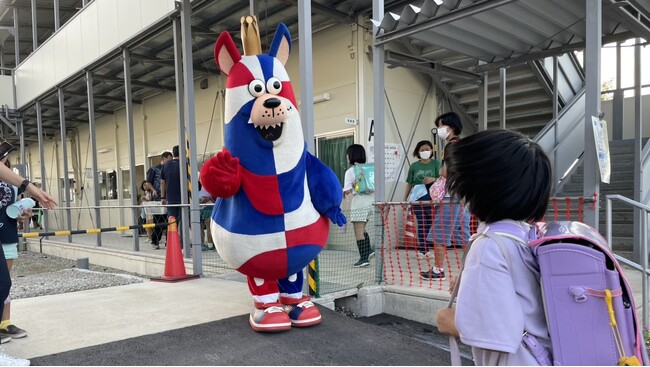 朝の時間もだんだんと涼しい秋風が吹き始め、ラジオ体操をしたりシャボン玉をとばしたり、玄関先に設置されたバスケットボールリングに登校してきた生徒がシュートをしたり、また学校独自のキャラクターがいたりと各学校で工夫された朝の活動がある中、子どもたちと元気に挨拶を交わしました。