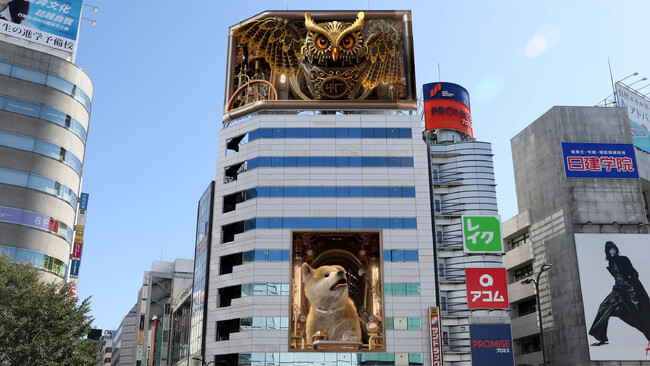 今回『池袋ヒットビジョン』で放映する動画は『巨大3Dカラクリ時計』。ヒットの看板犬である「秋田犬」と池袋の街のシンボルである「フクロウ」が登場して毎正時(毎時0分)をお知らせします。上下2面の大型ビジョンを動き回り、ときには肉眼3Dで飛び出す30秒の動画は池袋の新たな名物となるのでは!?