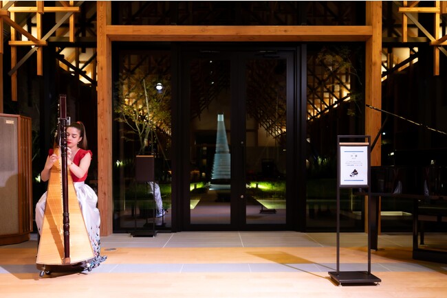 水のラウンジ「洸響」では上質な旅のカタチを彩るパラグアイハープの演奏会を2023年10月より開催しました。パラグアイハープは透明感のある音を奏で、華やかさの中に素朴さやあたたかみのある音色が特徴的です。音響空間にこだわった水のラウンジ「洸響」で約40分間1日2回の公演を実施しています。窓から幻想的に映し出されるライトアップされた「洸の路」の景色を望みながら、会場に心地よく響き渡るハープの生演奏をお愉しみいただけます。