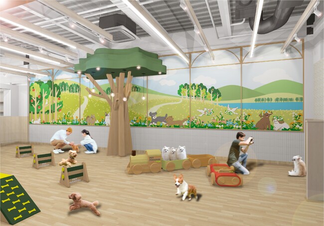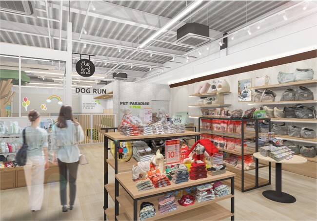 『PET PARADISE + FUN(ペットパラダイスファン)』は、お買い物だけではなく、「ワンちゃんとの楽しいひとときを共有する場」をコンセプトとし、従来の『PET PARADISE』の物販部分はそのままに、室内ドッグランを併設した新しいスタイルの店舗です。フォトスポットも用意されており、天候を気にせず遊べて、ほかの愛犬家の皆さんとの交流も楽しむことができます。