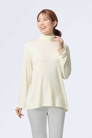 インナーとしていつものニットにプラスすると、着ぶくれせずによりあたたかく過ごせます。腕回りはすっきりしたデザイン、鎖骨ラインを綺麗に見せるボートネックで、重ねて着る洋服に響きにくい。