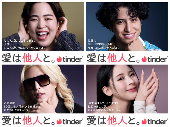 世界最大級のマッチングアプリ「Tinder」は、メンバーの半数以上が18~ 25歳であり、若者に向けたアップデートを続けています。 今年9月からは、日本の若者に向けて、友情、恋愛、コミュニティにおける新たな可能性を広げるため、ブランドキャンペーン「愛は他人と。」を展開しました。本キャンペーンでは、年齢問わず、幅広い世代から支持されるお笑い芸人のゆりやんレトリィバァさん、実業家・タレントのROLANDさん、動画クリエーターのKemioさん、モデルのミチさんがそれぞれの言葉と表現で「愛は他人と。」のメッセージを発信しています。