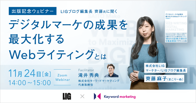 LIGが展開するLIGブログの編集長兼ライターである齊藤麻子氏が、初の著書『デジタルマーケの成果を最大化するWebライティング』を出版することを記念して、齊藤氏とキーワードマーケティング代表の滝井が対談形式でオンラインセミナーを開催します。