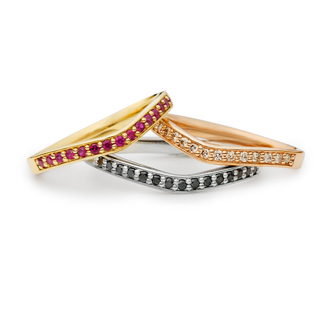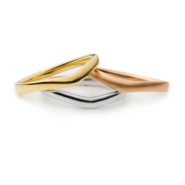 柔らかくV字を描いたリングをベースに、地金素材・仕上げ・アニバーサリーストーン(誕生石)の組み合わせができるリング。V字のマリッジリングとしてや、エンゲージメントリングとの重ね着けなど自由なアレンジを楽しめます。