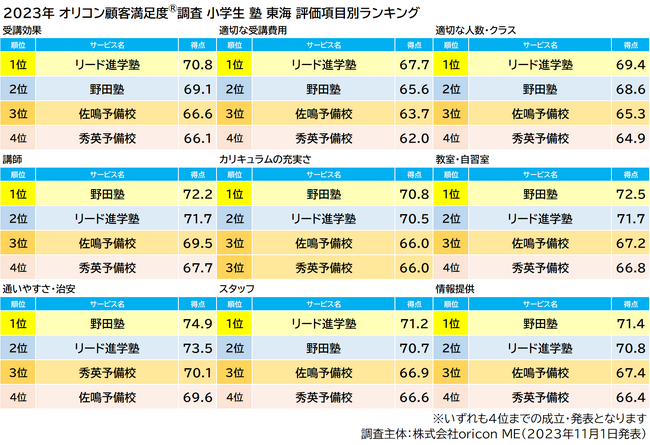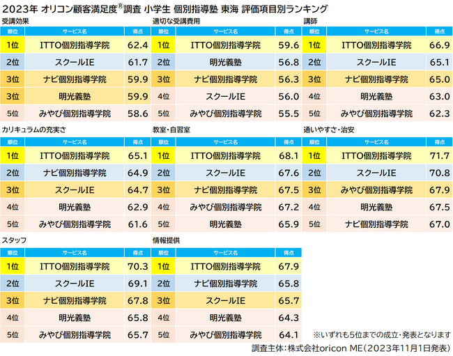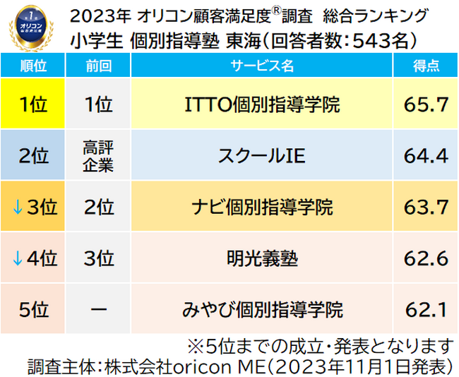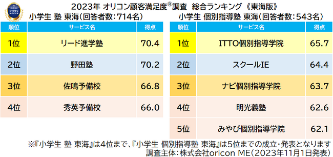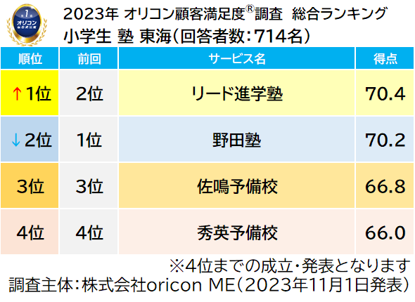 2023年 満足度の高い“小学生向け塾”ランキング《東海版》|『塾(集団塾)』リード進学塾が総合1位、『個別指導塾』ITTO個別指導学院が総合1位、ほか地場企業が1位複数受賞(オリコン顧客満足度調査)