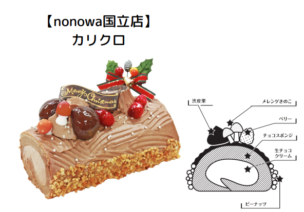 ・商品説明:職人が一つ一つ丁寧に手作りした、こだわりのブッシュドノエル。口溶けの良いチョコクリームに、マロンとベリーをトッピングしたクリスマスケーキです。