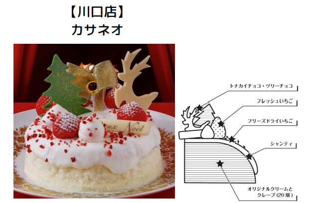 ・商品名:ミルクレープホワイトクリスマス12cm ・商品説明:真っ白なクレープ皮を使い、まるでショートケーキのようなミルクレープをクリスマス仕様に仕上げました。