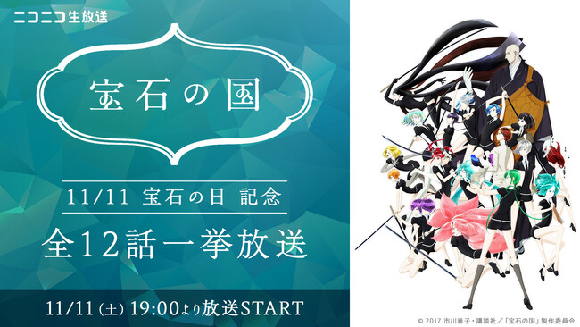 株式会社ドワンゴは、ライブ配信サービス「ニコニコ生放送」にて、2023年11月11日(土)の“宝石の日”を記念し、アニメ『宝石の国』の全12話を2023年11月11日(土)19時より無料一挙放送します。