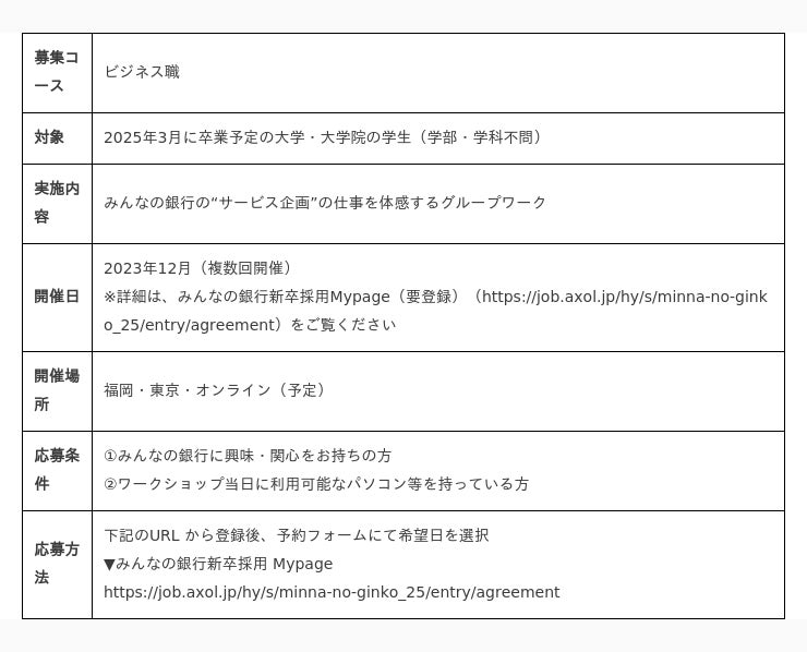 株式会社みんなの銀行(取締役頭取 永吉 健一、以下「みんなの銀行」)は、2025年卒業予定の大学・大学院の学生を対象に、「みんなの銀行の仕事を知る・体感する」ことを目的としたワークショップの参加者を募集します。