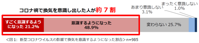 約7割の人がコロナ禍を機に換気への意識が高まった。
