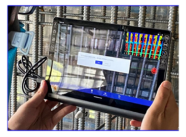 土木現場向けの鉄筋出来形自動検測システム。奥行の情報を取得する深度センサーを内蔵したデプスカメラ&Androidタブレットで撮影し、鉄筋の本数・間隔を自動でリアルタイム計測します。