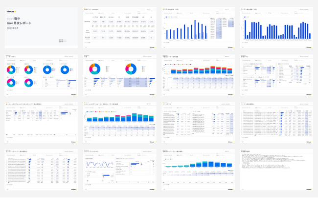 インハウスプラスをご利用いただく2,000社以上のお客様からのフィードバックを反映する形で、テンプレートをカスタマイズしなくてもできる限りそのまま使えるように、大人気のGA4月次報告用レポートテンプレートを大幅アップデートし、61ページに拡大しました。あらゆるニーズに対応できるテンプレートに仕上がっていますので、ぜひ無料のテンプレートをお試しください。
