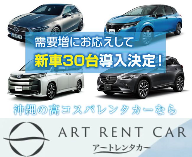 主に沖縄県のリゾートエリアにおいて「アートレンタカー」ブランドでレンタカー事業を展開する株式会社グランディズム(本社:東京都新宿区)は、同サービスにおいてノート、フィットなどのコンパクトカーから人気のメルセデスベンツ、BMWなどの輸入車までをラインナップした新車30台を新規導入する。