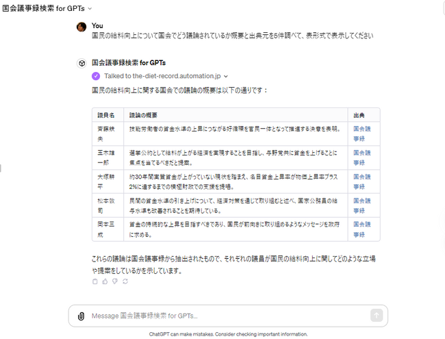 株式会社自動処理は、本日OpenAIより発表された独自ChatGPTを開発できる機能を利用して、国会議事録検索 for GPTsを開発・リリースしました!