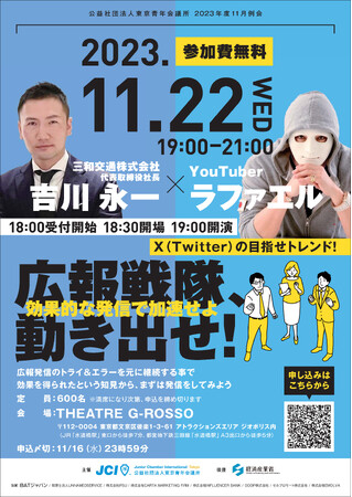 #ラファエル 氏、 #三和交通 (株)吉川社長、登壇!11月22日(水)18:00より受付開始!効果的なSNS発信を学ぶ!参加費は無料!『広報戦隊、動き出せ!効果的な発信で認知を拡大せよ』#水道橋