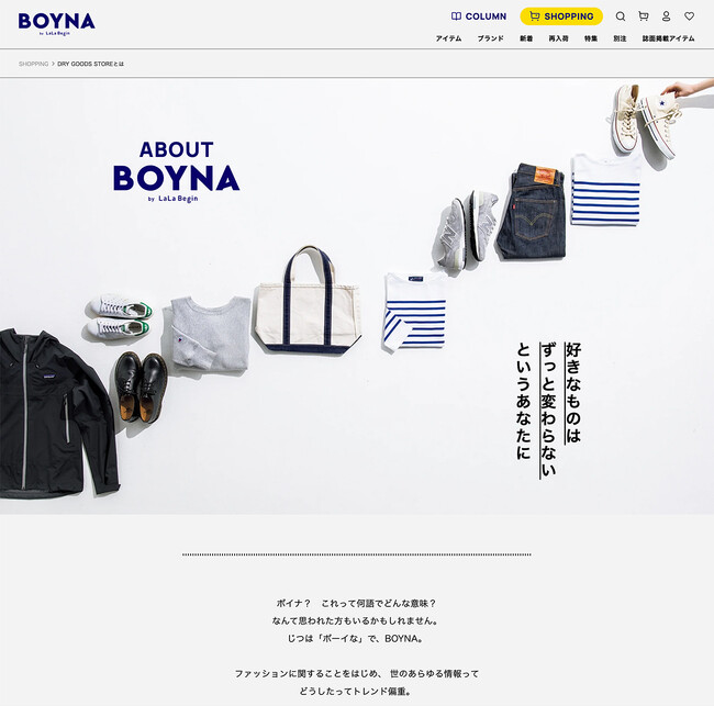 「BOYNA」─ その名前の由来は「ボーイな」。ボーイッシュなスタンダードアイテムを好むすべての人々に響くコンテンツを、との思いを込めて命名しました。サイトの二本柱は、COLUMN(読みもの)とSHOPPING(買いもの)。