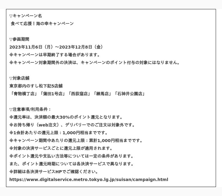 このたび松屋フーズ(本社:東京都武蔵野市、代表取締役社長:瓦葺一利)では、11月6日(月)0時より鮨専門店「すし松」におきまして、水産物への風評の懸念を払拭するため、消費を喚起することを目的として東京都の「水産物の消費喚起実行委員会」が実施している水産物支援策『食べて応援!海の幸キャンペーン」への参画を決定いたしました。