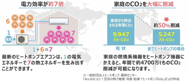 また、ヒートポンプは空気を暖めるだけでなく、水を温めてお湯にすることもできます。日本では、この原理を利用したヒートポンプ給湯機「エコキュート」が、お風呂やシャワーなどの給湯に利用されています。家庭の空調や給湯で使用されているガスや石油などを使う燃焼系機器をヒートポンプ機器にかえると、家庭のCO2排出量は約半分になるともいわれています。