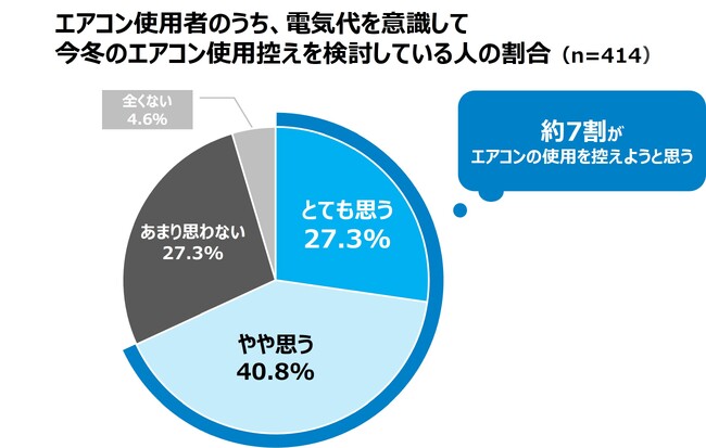 冬に使用する暖房器具は様々です。「あなたが自宅で使用している暖房器具は何ですか?」と尋ねたところ、78.4%の人が「エアコン」と回答しました。また、自宅の暖房器具としてエアコンを使っている人を対象に「今年の冬は電気代を意識して、エアコンの使用を控えようと思いますか?」と質問したところ、約7割が「とても思う(27.3%)」「やや思う(40.8%)」と答えました。