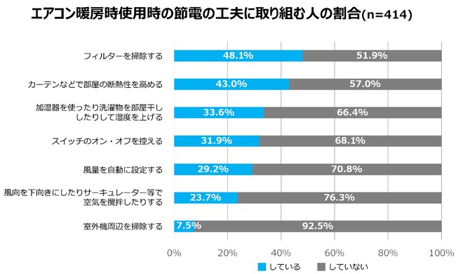 また、全体の半数以上が、エアコンのフィルター掃除や室外機周辺の整理整頓など、エアコンの基本的な節電に取り組んでいないことも明らかとなりました。今回の調査では、加湿や空気の攪拌など「設定温度を上げる前にできる節電の工夫」だけでなく、「エアコンの基本的な節電方法」を知らない人が多い可能性もうかがえる結果となりました。