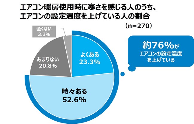 エアコン暖房使用時に肌寒さを感じる人のうち、約76%が「エアコンの設定温度」を上げている