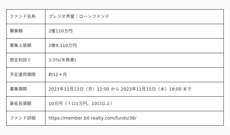 ビットリアルティ株式会社(本社:東京都千代田区、代表取締役社長:佐伯俊輔、以下「当社」)は、個人でも非上場の不動産ファンドに投資ができるオンライン不動産投資プラットフォーム「bitREALTY(ビットリアルティ)」において、11月13日(月)12:00に「プレジオ芦屋:ローンファンド」の募集を開始いたします。