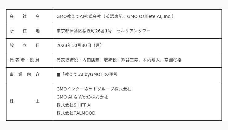 【GMO教えてAI株式会社について】※2023年11月7日(火)時点