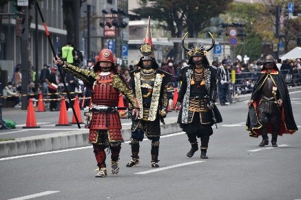 第50回の開催を迎える信玄公祭りを記念し、甲府市中心街のハロウィンイベントである「ハッピーハロウィンin甲府」とコラボしたハロウィン仮装パレードを今年も開催。今年は、当日の飛び入り参加の受付も行い、思い思いの仮装をした方々や段ボール甲冑姿のかわいい幼児達、本格的な甲冑姿の武者、武将姿の外国人などの多様な人々が、信玄公祭りを通じて、自分らしさを表現し、多様性を認め合う象徴として参加し、パレードを盛り上げました。