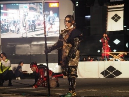 舞鶴城公園特設ステージで行われた出陣式では、舞台上に初めて設置された花道で甲府商業高校ソングリーダー部が扮する女武者たちが華麗な舞で観客を魅了すると、甲冑を身にまとった冨永さんが堂々のランウェイを披露。戦を嫌い、戦の無い世を願うというメッセージとともに、誰よりも強く優しい信玄公を演じました。