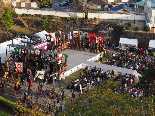駅前では、山本勘助が迫力満点の殺陣を披露。また、平和通りから舞鶴城公園に戻るまでの行進では、乗馬した信玄公率いる甲州軍団による勇壮華麗な武者行列に、新たに設置した有料観覧席や観覧ゾーンに集まった多くの観客が圧倒されていました。
