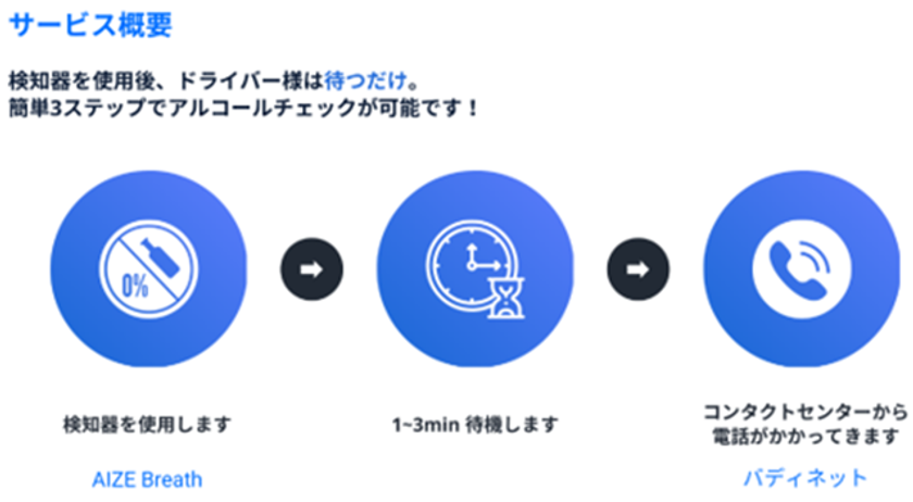 これまで、バディネットは24時間365日有人 アルコールチェック代行サービスを提供してまいりました。アルコールチェック代行サービスは、コンタクトセンターで運転前のアルコールチェックを安全運転管理者に代わり対応を行うもので、24時間365日リアルタイムでのアルコールチェックを可能にするサービスです。早朝夜間や直行直帰などのシーンを中心に安全運転管理者の業務負荷が軽減でき、ユーザーから高い評価を受けています。