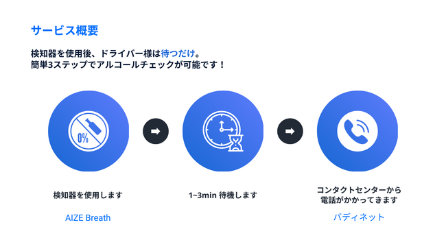 アルコール検知器を活用した酒気帯び有無の確認義務において課題となっていたのが、リアルタイムでの酒気帯び有無の確認です。早朝や深夜時間帯には安全運転管理者をはじめとした確認者の確保が困難であることから、今回、電話による飲酒検査の代行サービスを提供してきたバディネットとサービス連携を行い、飲酒検査業務に課題を抱える企業に対し、検知器によるアルコールチェックと電話確認をワンストップで提供することで、当該業務に発生するトータルコストの削減を実現いたします。