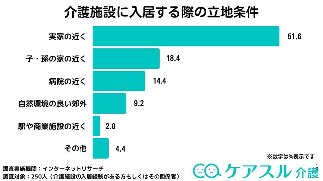 介護施設に入居する際の立地条件としては、「実家の近く」と回答した方が最も多く、全体の51.6%を占めている。
